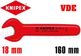 - Cờ lê cách điện Knipex 98 00 18, Knipex VDE Spanner 98 00 18 là loại cờ lê một đầu miệng hở dùng để siết bulong, đai ốc size: 18 mm, chuyên dùng để siết trong môi trường điện cao thế ( <1.000 V).
