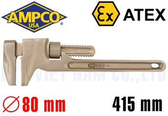 - Mỏ lết ống chống cháy nổ Ampco AU415A, Kìm ống chống cháy nổ Ampco AU415A, Ampco non sparking pipe spanner AU415A có độ mở max: 80 mm, chiều dài tổng thể 415 mm, chuyên dùng để siết bulong, đai ốc …trong môi trường yêu cầu tính phòng chống cháy nổ.
